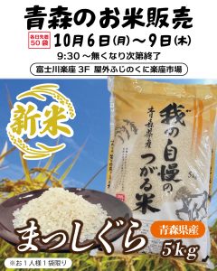 10月6日(月)~9日(木)の4日間、青森県産「まっしぐら」5kgの数量限定販売を行います。